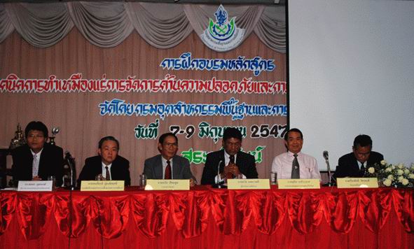 กรมอุตสาหกรรมพื้นฐานและการเหมืองแร่ โดยกลุ่มวิศวกรรมและความปลอดภัย สำนักเหมืองแร่และสัมปทาน จัดฝึกอบรมหลักสูตร "เทคนิคการทำเหมืองแร่ การจัดการด้านความปลอดภัย และการป้องกันผลกระทบสิ่งแวดล้อม" สำหรับผู้ประกอบการเหมืองแร่ เหมืองหิน แลโรงโม่หินในเขตภาคกลาง และภาคตะวันออก เพื่อเผยแพร่ความรู้ทางเทคนิควิศวกรรมการทำเหมืองแร่ การจัดการด้านความปลอดภัย เทคนิคการใช้วัตถุระเบิด การป้องกันผลกระทบจากการใช้วัตถุระเบิดในงานเหมืองแร่และเหมืองหิน และการป้องกันผลกระทบสิ่งแวดล้อมจากการทำเหมือง ระหว่างวันที่ 7-9 มิถุนายน 2547 ณ โรงแรมสระบุรีอินน์ จังหวัดสระบุรี |