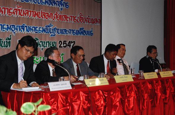 (จากซ้าย) ดร.ทศพร นุชอนงค์ ผู้อำนวยการกองอนุรักษ์และจัดการทรัพยากรธรณี กรมทรัพยากรธรณี นายสมเกียรติ ภู่ธงชัยฤทธิ์ รองอธิบดีกรมอุตสาหกรรมพื้นฐานและการเหมืองแร่ รศ.ฉดับ ปัทมสูต นายกสภาวิศวกร นายธวัช ผลความดี ผู้อำนวยการกองการสอบสวนและนิติการ กรมอุตสาหกรรมพื้นฐานและการเหมืองแร่ (ผู้ดำเนินการอภิปราย) นายสุทิน ภาศิวะมาศ นายกสมาคมอุตสาหกรรมย่อยหินไทย และอาจารย์เรืองศักดิ์ วัชรพงศ์ วิศวกรเหมืองแร่อาวุโส ให้เกียรติร่วมอภิปราย